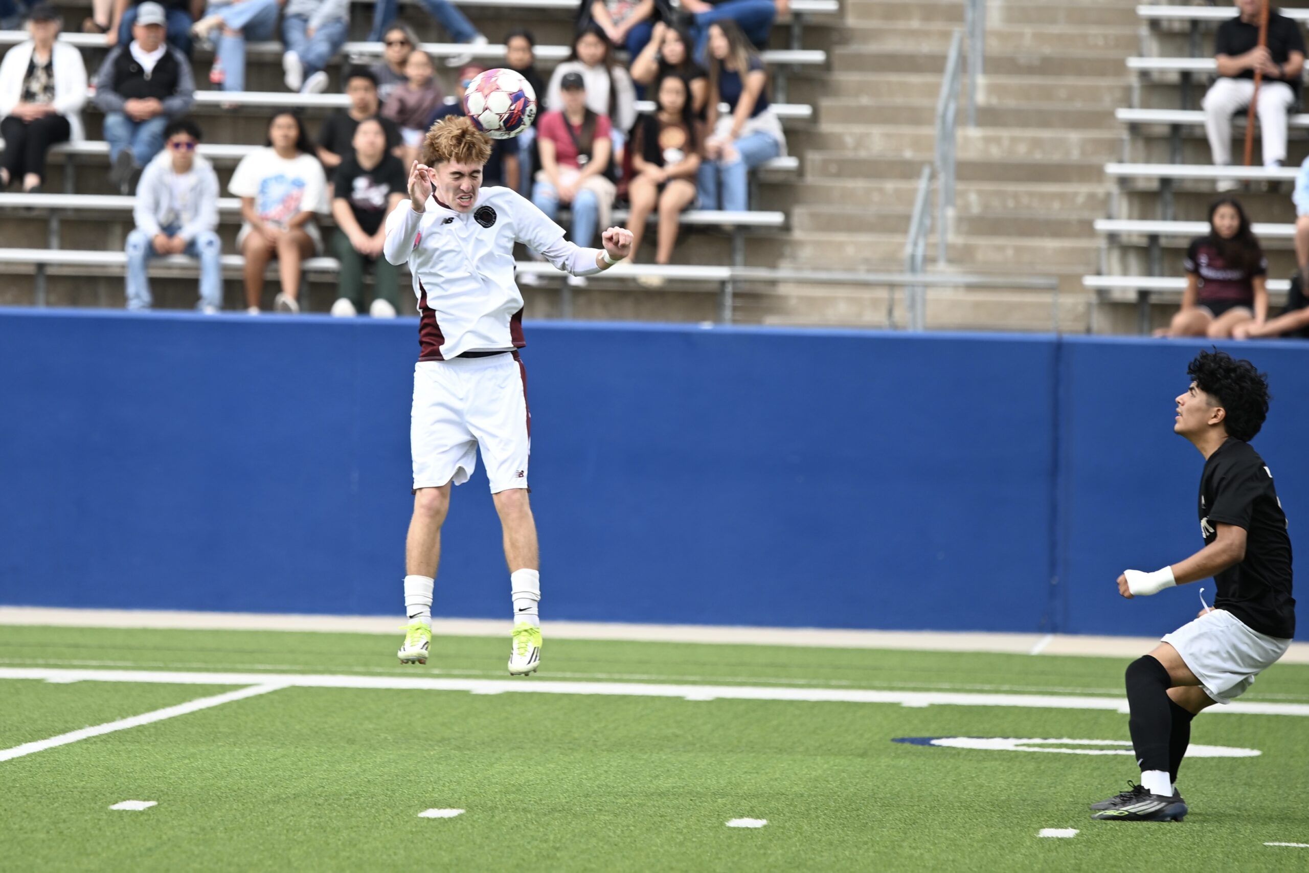 Xxavier Garza heads the ball for Bridgeport in the 4A Division II State Semifinal against Dallas Pinkston Friday. Garza scored one goal in the 3-1 win at McKinney ISD Stadium to help the Bulls make a return to the state championship for the first time since 2017. MICAH MCCARTNEY | WCMESSENGER