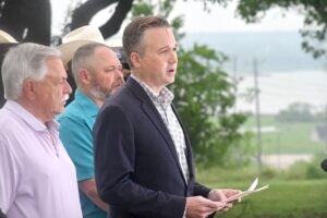 County Judge J.D. Clark speaks at a press conference Sunday at the Norma Coble Civic Center in Runaway Bay. BRIAN KNOX/WCMESSENGER