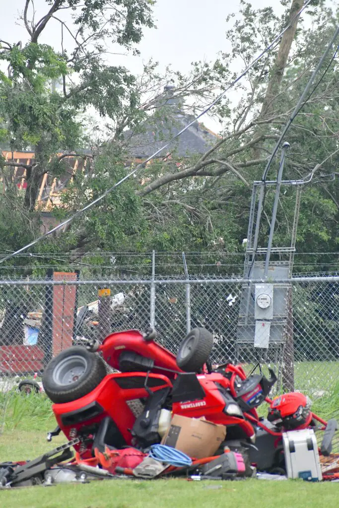 A riding lawnmower sits overturned among debris in a heavy hit neighborhood. BRIAN KNOX/WCMESSENGER