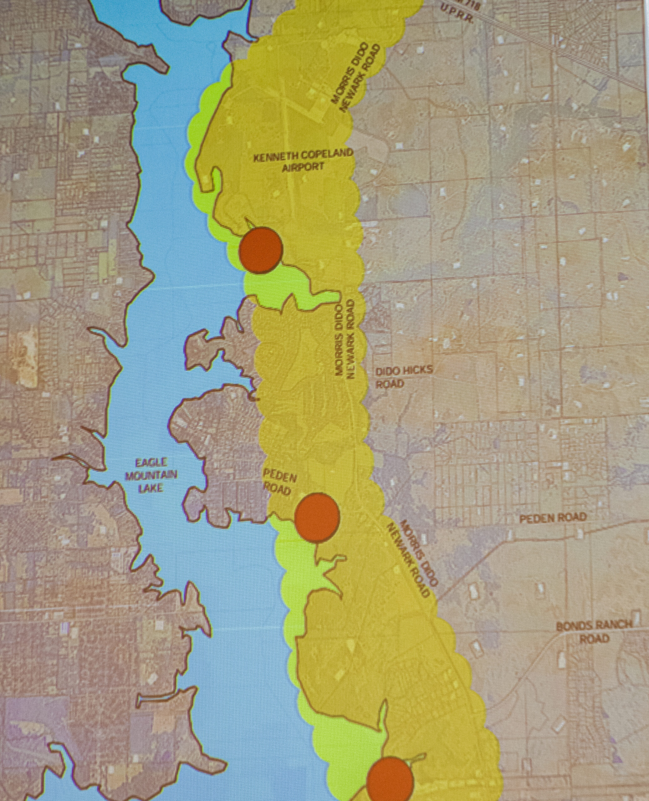 Above are prospective intake locations on Eagle Mountain Lake that may be considered if the West Fork PUA is formed. The map of possibly feasible locations was presented at a Wise County Mayors Coalition event in July at the Decatur Conference Center. FILE | WCMESSENGER