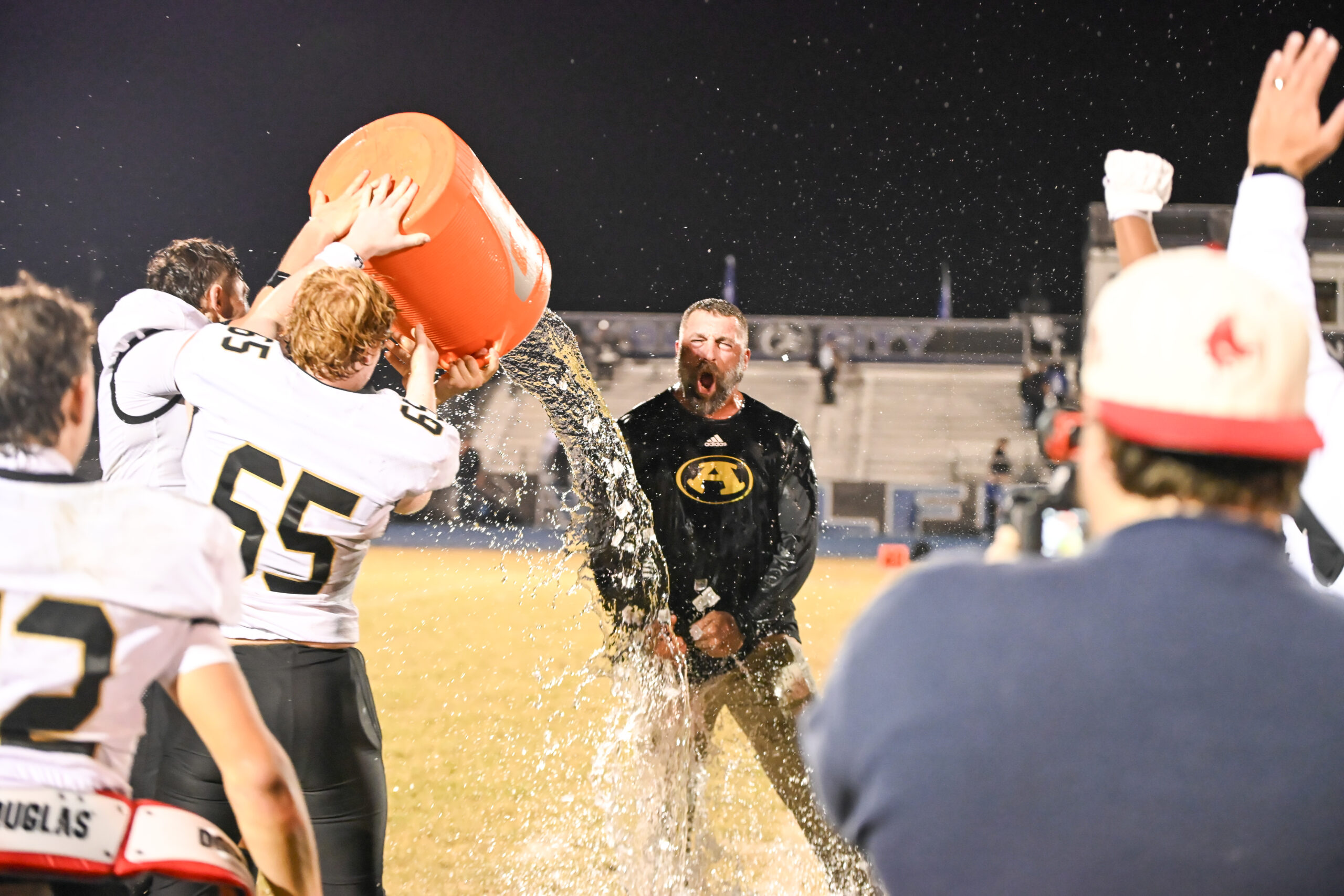 Alvord players shower coach Matt Fanning with a water cooler following the Bulldogs’ 62-28 District 6-2A Division I title-clinching win over Wolfe City Friday at Don Howard Stadium. The win served as the first league championship in Fanning’s tenure at Alvord. MICAH MCCARTNEY | WCMESSENGER