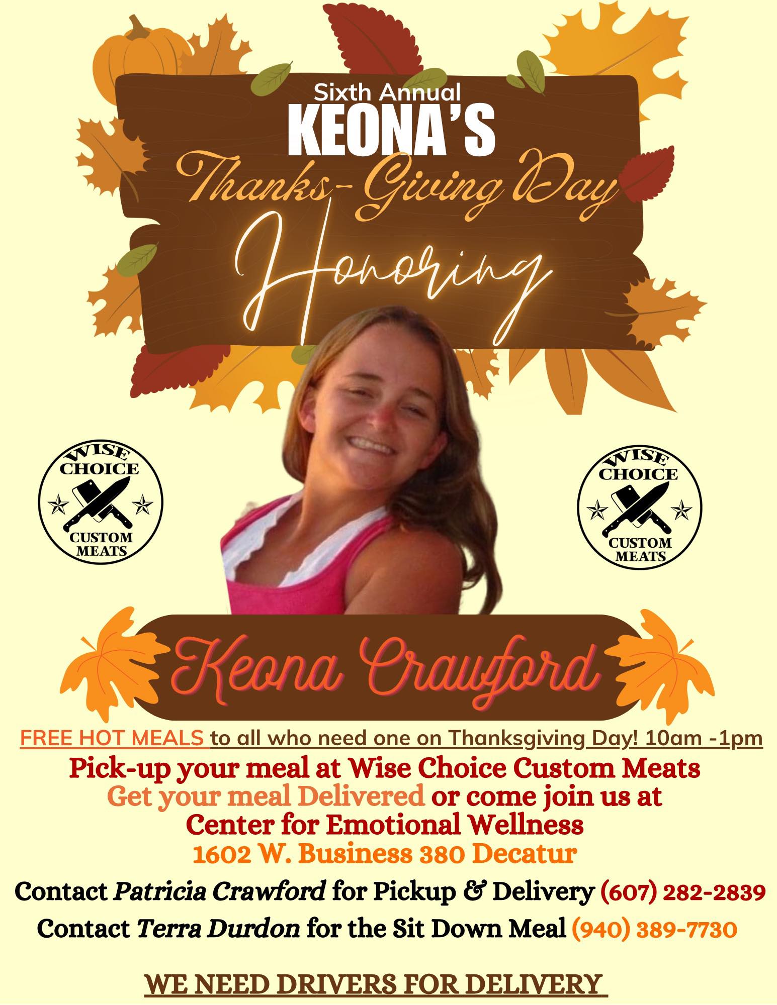 During the 6th annual Keona’s Thanks-Giving Day, the family and volunteers will serve free hot meals from 10 a.m. to 1 p.m. at the Center for Emotional Wellness, 1602 W. Business 380 in Decatur, while also delivering free Thanksgiving meals.