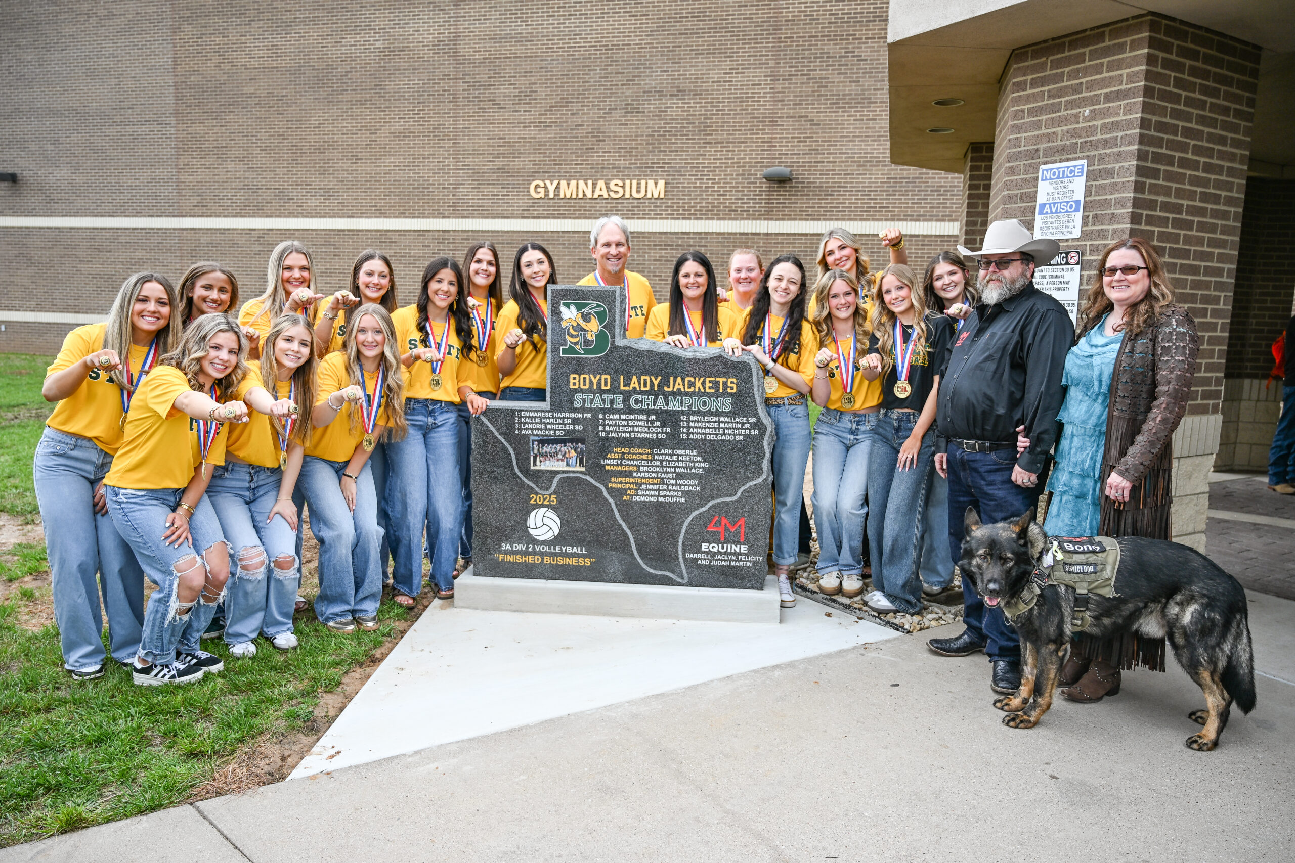 The Boyd Lady Jacket volleyball team received their state rings and unveiled a monument outside of the Boyd High School Gym during a championship celebration Tuesday. Boyd (36-9) captured its first volleyball state title by sweeping Clifton in the 2025 3A Division II state final — 25-23, 25-21, 25-10. MICAH MCCARTNEY | WCMESSENGER