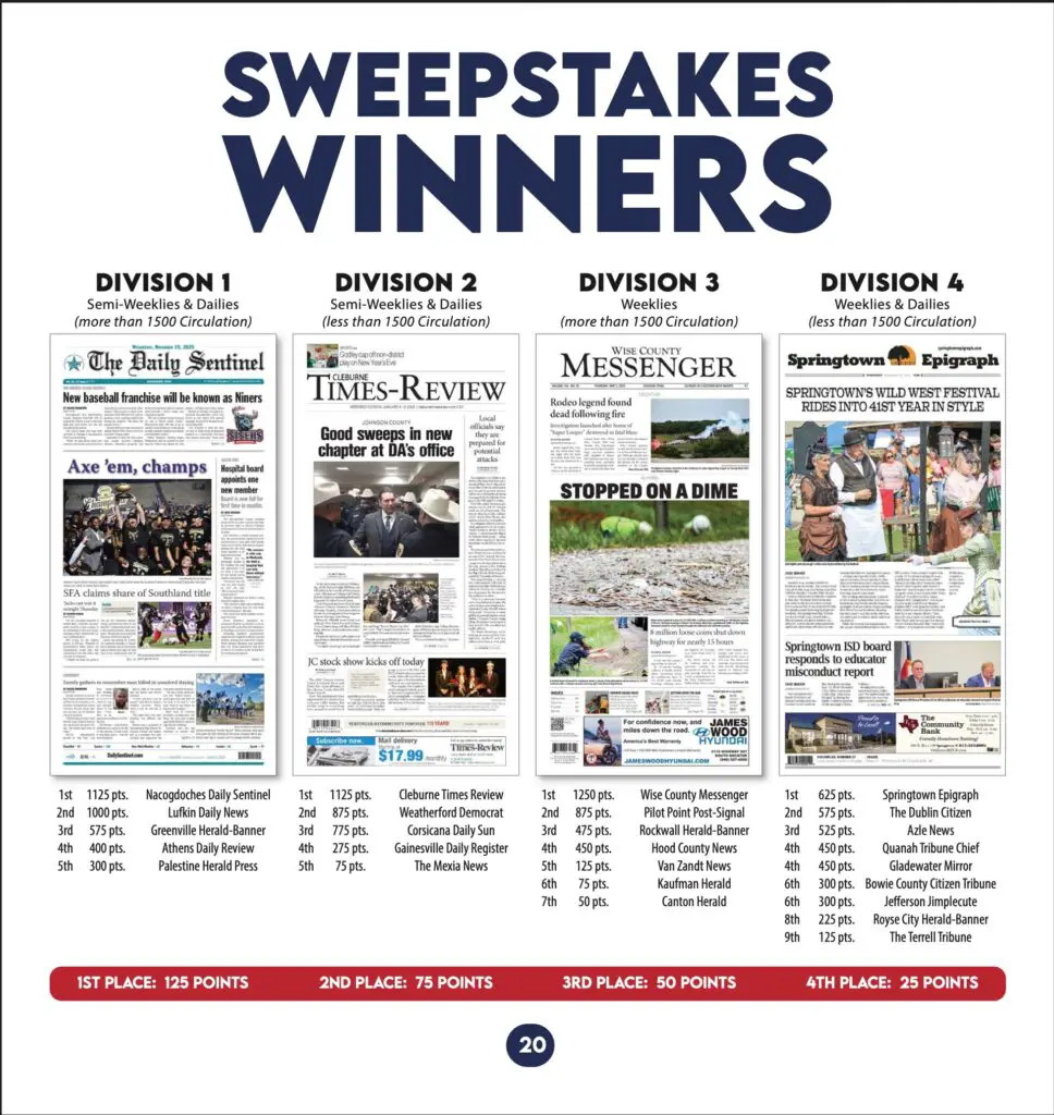 Competing in the large weekly division, the Messenger took this year’s Sweepstakes crown with a combined 1,250 points — the most of any of the four divisions. The award is given to the newspaper that accumulates the most points across a variety of categories. The Pilot Point Post-Signal finished second with 875 points, followed by the Rockwall Herald-Banner (475) and Hood County News (450).