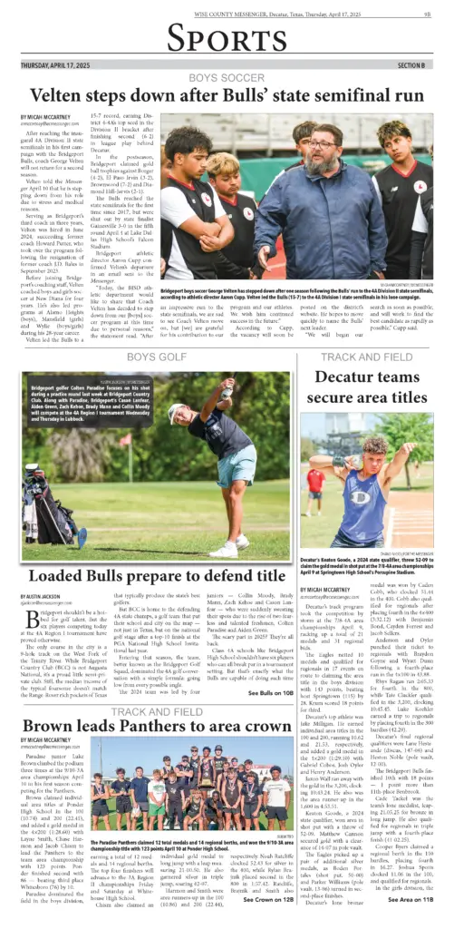 The Messenger’s first place awards include: general excellence, column writing, feature photo, feature story, headline writing, news writing, news photo and sports coverage, as well as Sports Photographer of the Year and the NETPA Community Service Award — two contests that span all divisions, from large dailies to small weeklies. This year’s contest was judged by the Texas Gulf Coast Press Association.
