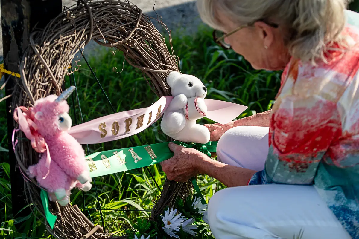 A resident of Wagon Trails Estates near Decatur places a wreath in memory of Sophia and Nolan Christensen at a memorial at the entrance to the neighborhood. AUSTIN JACKSON | WCMESSENGER