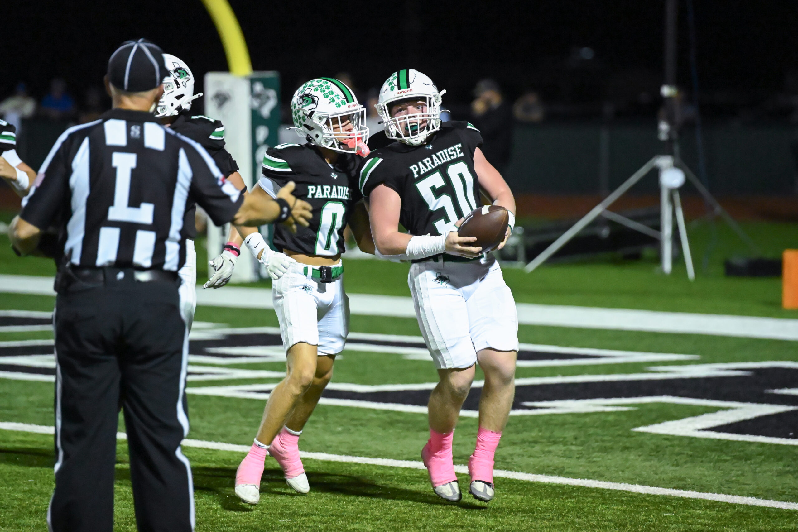 The Paradise defense forced four Greyhound turnovers via interceptions by Wyatt Sanders, Cash Watson and Camden Walker, and Beau Chenevert’s game-changing fumble-six to lift Paradise to the win.