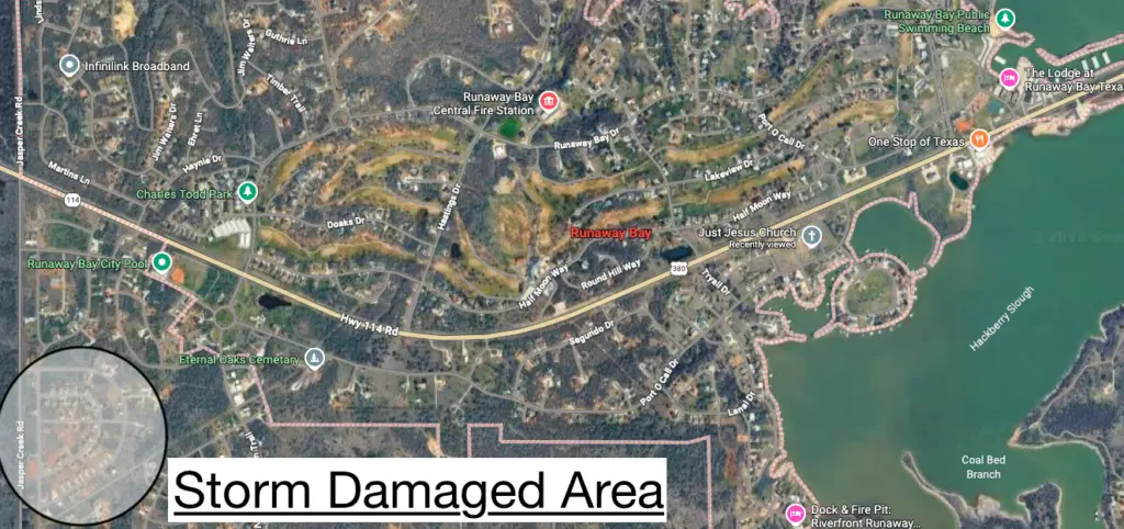 First responders reported homes in the area of Overland Trail, Cumberland Trail, Cactus Canyon Drive and Brookview Drive on the west side of Runaway Bay sustained significant damage with reports of “debris everywhere” along with downed power lines and trees in the neighborhood. Some people were trapped in their homes and had to be rescued, according to emergency radio.