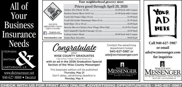 SENIOR PROM — The Decatur High School Health Occupations Students of America (HOSA) will hold its annual prom for Wise County residents 55 years old and older. The “Garden Gala” is 6 to 9 p.m. Saturday at the Decatur Conference Center. Entry is free, but donations will be accepted. RSVP at wcmess.com/gardengala26.