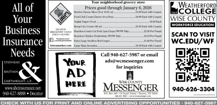 DECATUR ISD SCHOOL CALENDAR SURVEY — The Decatur ISD community can weigh in on next year’s school calendar with a survey on two calendar options for the 2026/27 school year. Highlights of Option “A” include the following: First day of school, Wednesday, Aug. 5; Monday holidays, Sept. 7, Jan. 18; Students back from winter break: Jan. 4; Last day of school: May 26; Total instructional days and minutes: 154 days/77,000 minutes. Highlights of Option “B” include the following: First day of school: Thursday, Aug. 6; Monday holidays: Sept. 7, Oct. 12, Jan. 18, Feb. 15; Students back from winter break: Jan. 5; Last day of school: May 26; Total instructional days and minutes: 153 days/76,500 minutes. The survey at decaturisd.us will remain open until 11:59 p.m. Wednesday.