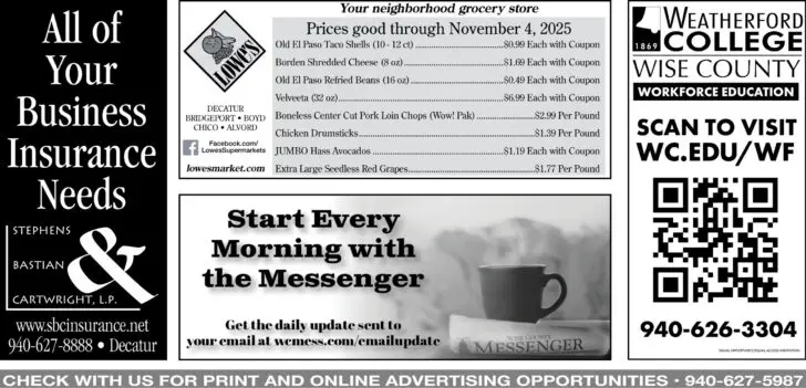 EARLY VOTING ENDS TODAY — Today is the last day of early voting in next Tuesday’s election. The good news is you have extended hours voting with polls open 7 a.m. to 7 p.m. at the four early voting locations: the Women’s Building at the Wise County Fairgrounds, 3101 S. Farm Road 51, Decatur; Boyd Community Center, 420 E. Morton Ave.; Bridgeport Community Center, 1102 Lawdwin Ave.; and Alvord City Hall, 215 W. Elm. Yesterday, another 789 ballots were cast.