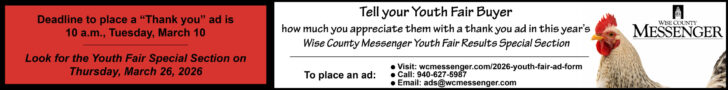 YOUTH FAIR CONTINUES — Things really get rolling today at the Wise County Youth Fair in Decatur with a number of events. The breeding dairy goat show is at 10 a.m., rabbit breed ID contest 11 a.m. to 2 p.m., meat pen rabbits judged at 1 p.m. followed by breeding rabbits, longhorn show at 1 p.m. and breeding swine show at 4 p.m. Viewing of 4-H, FCCLA and horticulture projects continue 9 a.m. to 2:30 p.m.