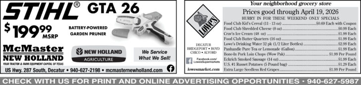 BASEBALL RESULTS — Decatur (17-6-1, 9-0) kept its District 7-4A record unblemished by outlasting Eagle Mountain in a league bout Tuesday, 3-2. Bridgeport (9-15-1, 4-5) also found the win column, earning a 4-1 league win against Lake Worth. In 10-3A, Paradise (22-3, 9-0) remains unbeaten after a 15-0 shutout win over Callisburg in five innings. Alvord (16-7, 5-2) grabbed its fifth 10-2A victory after defeating Lindsay, 9-1. Chico (1-15, 0-7) remains winless in league play, dropping an 18-1 loss to Muenster in five innings.