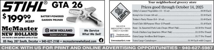 AG ROUNDUP — The Wise County Ag Roundup, formerly known as the Ranchers Gathering, is Monday at First Baptist Church Decatur. Doors open at 5 p.m. so attendees can visit vendor booths, and the dinner and program is 6 to 8 p.m. Dr. Jason Banta, Texas A&M AgriLife Extension beef cattle specialist, will give a program on Effective Supplementation Based on Hay and Forage Quality. Register by Thursday at the Extension office in Decatur.